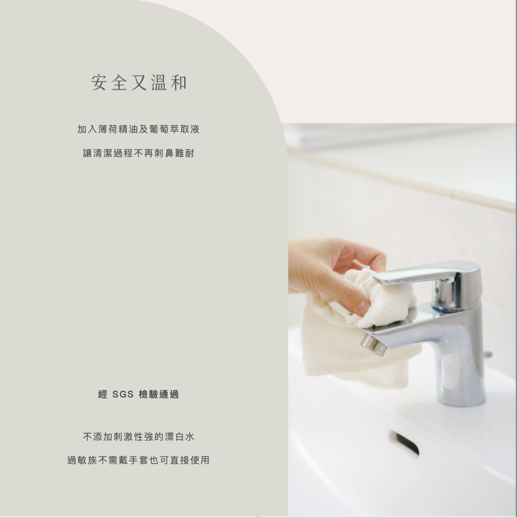 ⚠️ 勿使用於電鍍材質、無釉地磚、大理石、石英磚、天然石材等有毛細孔之材質。