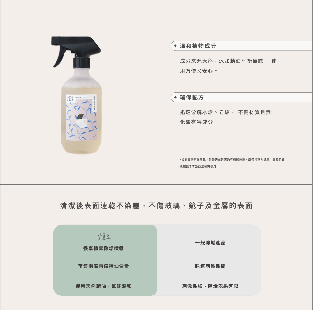 ・植物萃取成分簡單溫和,無添加漂白水,噴灑時不燻眼不刺鼻。