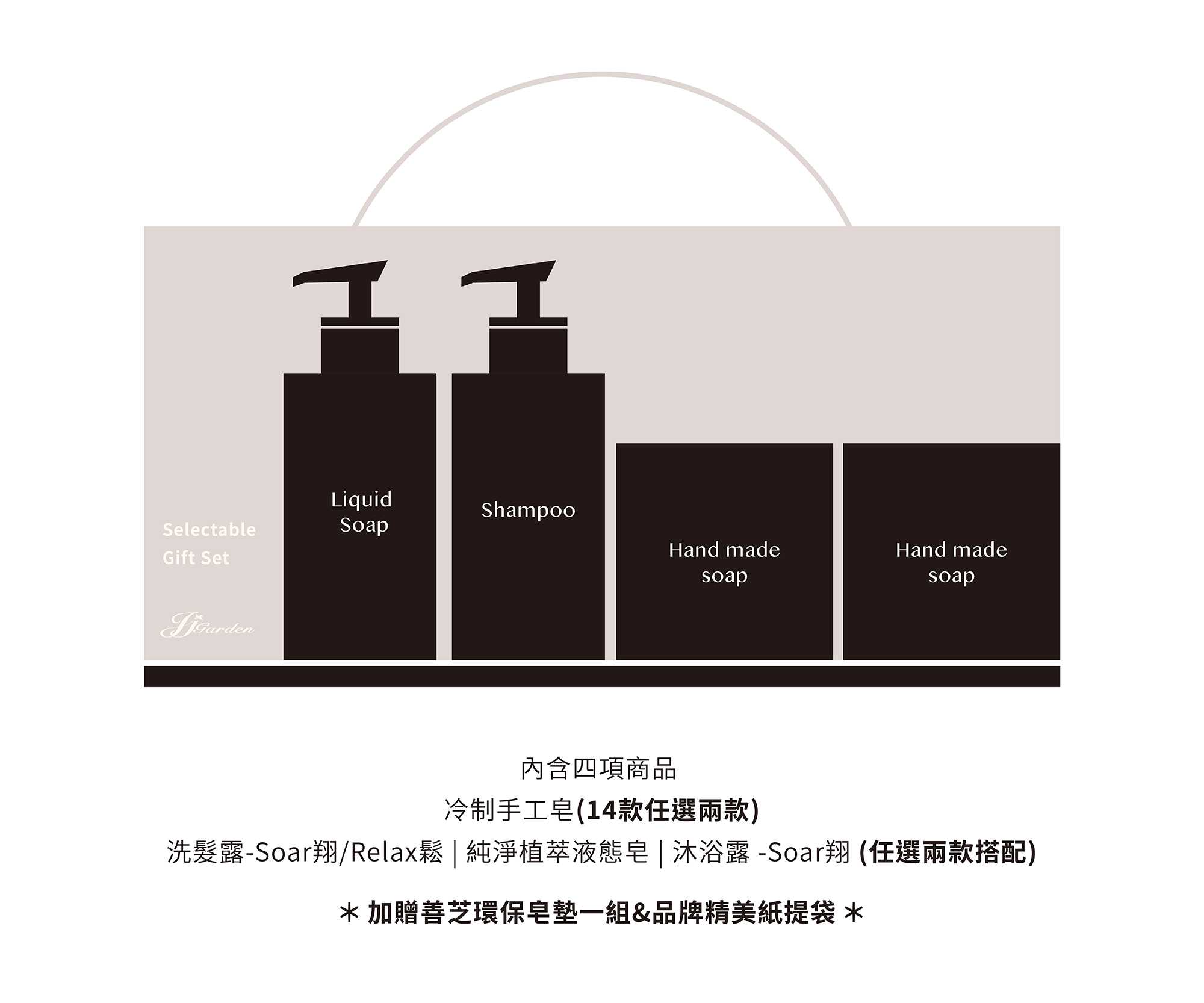 *禮盒內含: 精選冷製手工皂兩顆 (14選2) + Relax鬆系列-洗髮露 /植萃液態皂/ Sour翔系列洗髮露 /沐浴露 (4選2)